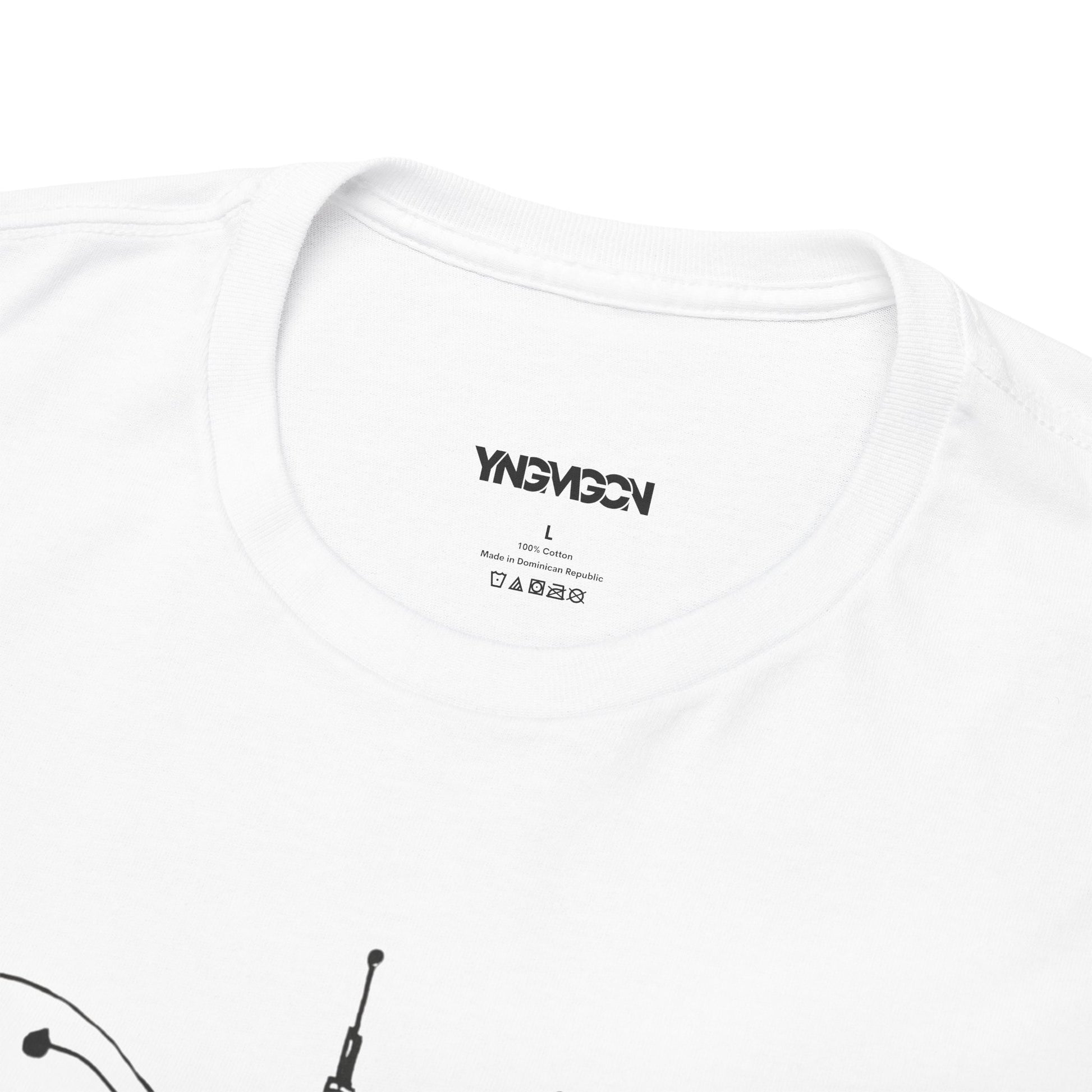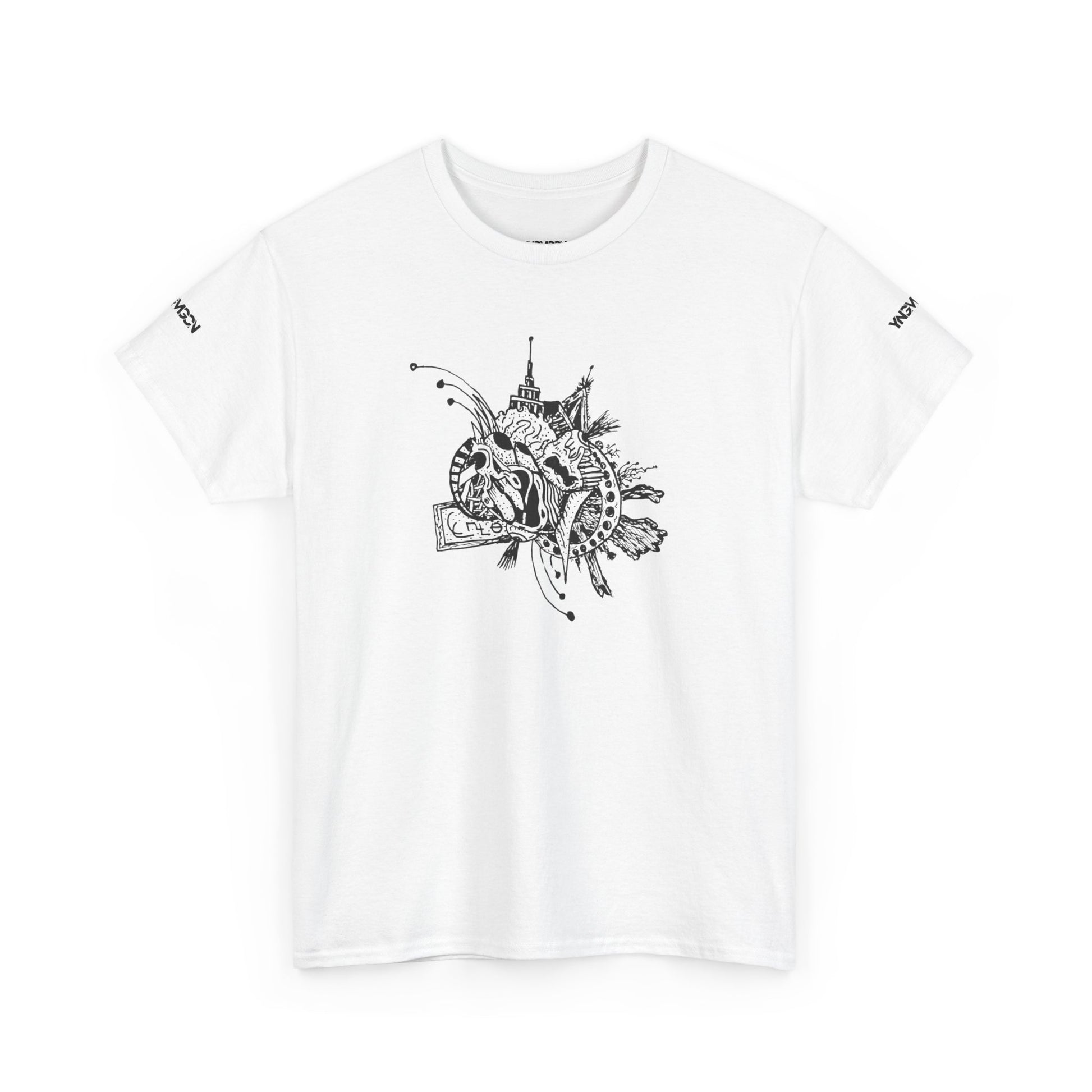 A trippy and abstract hand-drawn T-Shirt featuring artwork by artist JonyRay on the front, with YNGMGCN branding on the sleeves and back. This T-Shirt is perfect for those looking for a unique and artistic addition to their wardrobe. It is relevant for art enthusiasts, fashion-forward individuals, and those looking to make a statement. Ideal for casual wear, art events, music festivals, and creative gatherings.